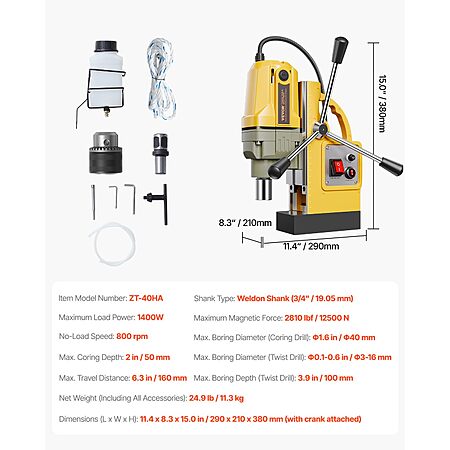 - Top-level Magnet: Get ready for unstoppable power! Our electric mag drill generates exceptionally powerful driving force with its 1400W copper motor. It is capable of drilling into the toughest material at 800 RPM. Max. Boring Diameter (Coring Drill): Φ1.6 in / Φ40 mm; Max. Coring Depth: 2 in / 50 mm