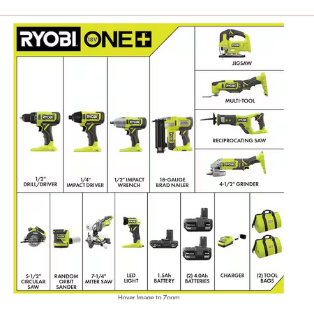 | Product Description: | Enter the RYOBI 18V ONE+ System with the RYOBI 18V ONE+ 12-Tool Combo Kit – 1/2 in. Drill/Driver, 1/4 in. Impact Driver, Reciprocating Saw, 5-1/2 in. Circular Saw, Multi-Tool, Jig Saw, Brad Nailer, 4-1/2 in. Angle Grinder, Random Orbit Sander, 1/2 in. Impact Wrench, 7-1/4 in. Miter Saw, LED Light, (2) 18V 4.0 Ah Lithium Batteries, 18V 1.5 Ah Lithium Battery, Charger, and (2) Tool Bags. The RYOBI 18V ONE+ System gives you the power to do more - bringing the ultimate in cordless versatility and variety to tackle any project at home or on the jobsite and everything in-between. No matter your interest or skill level, RYOBI can power it! The key to the System lies in the 18V Lithium Batteries that provide fade-free power for maximum performance and feature a high-visibility integrated fuel gauge to monitor remaining runtime. Best of all, this kit is part of the RYOBI 18V ONE+ System of over 300 Cordless Products that all work on the same battery platform. This 18V ONE+ 12-Tool Combo Kit is backed by the RYOBI 3-Year Manufacturer's Warranty. |