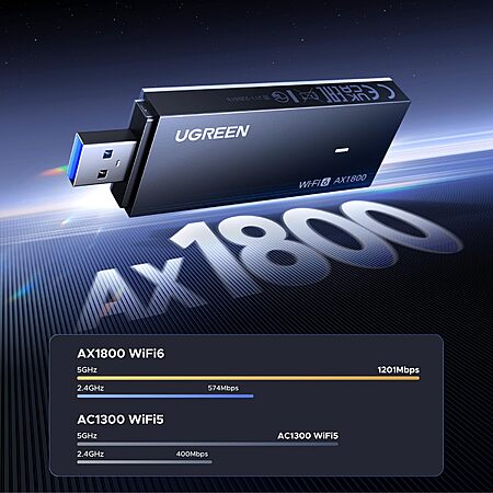 UGREEN GROUP Limited via Amazon has UGREEN AX1800 WiFi 6 USB Dual Band Network Desktop Adapter Dongle (2.4/5GHz) on sale for $19.99.Shipping is free w/ Prime or on $35+ orders.