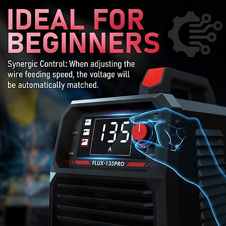 - SYNERGIC CONTROL: The wire feeding speed is flexibly adjustable (030": 120-420 in/min;.035'': 120-308 in/min). When adjusting the wire feeding speed, the voltage will be automatically matched to a recommended value, and you can fine tune the voltage between -3V~3V. Ideal for both beginners and seasoned professionals.