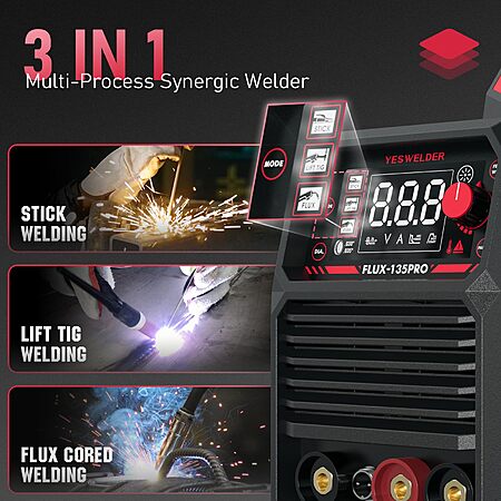 YESWELDER via Amazon.com has YESWELDER 135A MIG Welder, 110V Flux Core MIG/Lift TIG/Stick 3-in-1 Large LED Digital Display Welding Machine IGBT Inverter Welder on sale for $100.