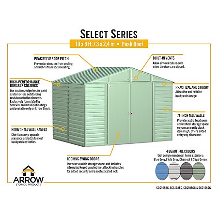 Amazon.com has Arrow Select 10' x 8' Outdoor Lockable Steel Storage Shed Building, Blue Grey on sale for $479.99.