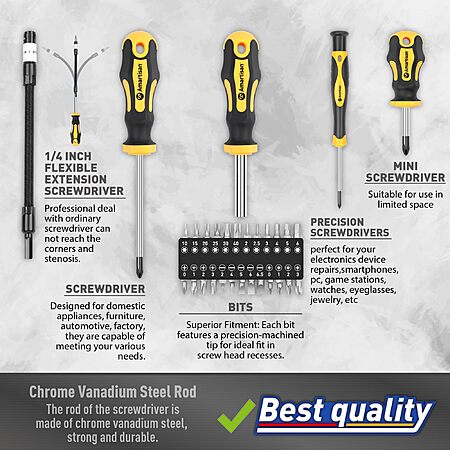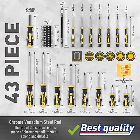 - 43-piece magnetic screwdriver set consists of 8 Conventional screwdriver,6 Precision Screwdriver and 25 screwdriver bits.There are 5 different screw types including Phillips, Slotted, Torx, Hex and Pozidriv, 1 Magnetizer Demagnetizer Tools