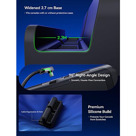 - Improved airflow through an open, non-slot stand design. Ventilation holes allow natural heat dissipation during docked play. This is passive auxiliary cooling with no fan, designed to reduce heat buildup without noise, extra power draw, or moving parts, while also preventing scratches during docking