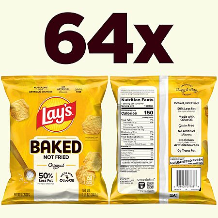 Baked Lay’s Potato Chips, Original, 1.125 oz Bags, (64 Pack), 50% Less Fat, Gluten Free, No Artificial Flavors, No Colors from Artificial Sources~$30.82 With S&S @ Amazon