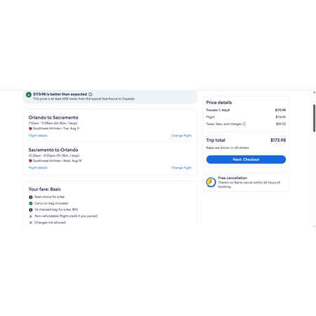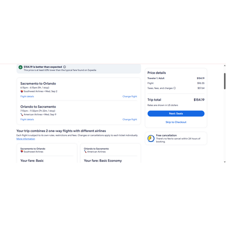American Airlines, Southwest Airlines and Expedia have limited round trip airfares travelling to and from Sacramento CA (SMF) and Orlando FL (MCO) for $155-$174, making 1 stop both ways. These are basic economy fares that allow a personal item and a carry-on bag. There is no seat selection and no change.