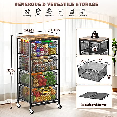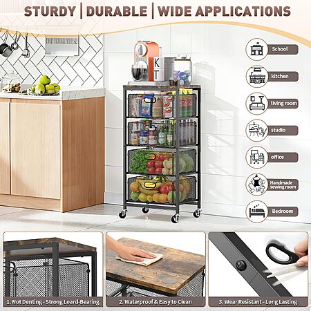 - Durable Wooden Top & Sturdy Metal Frame:With a robust wooden surface and a heavy-duty metal frame, this metal kitchen storage cart can support up to 156 lbs, providing reliable storage for a variety of items without compromising on stability.