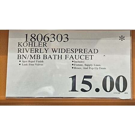 Was at Costco today and saw that they had the Kohler Riverly Widespread Bathroom Sink Faucet for $15.00, normally $99.99. Took a picture, grabbed one for my downstairs bathroom and checked out. Yup $15.00. Great deal. YMMV