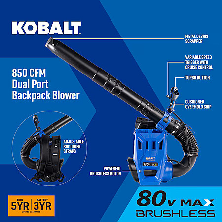 Lowe's has Kobalt Dual Port 80v 850-CFM 210-MPH Cordless Battery Backpack Leaf Blower Battery and Charger Not Included on sale for $189.