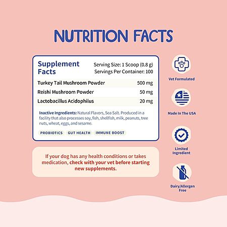 Active Ingredients::Turkey Tail Mushroom Powder, Reishi Mushroom Powder, Lactobacillus Acidophilus