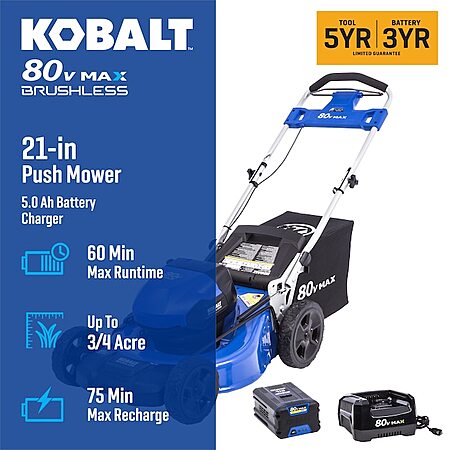 Kobalt 80V MAX 21" Brushless Push Lawn Mower w/ 5 Ah Battery & Charger $299 + Free Store P/U at Lowe's