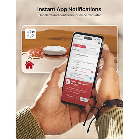 • When a water leak is detected, a red light will flash on the water leak detector and the base station will sound an alarm up to 100 dB; you'll also get an app alert on your phone, so you can learn about leaks even if you're away