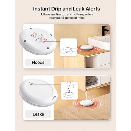• Featuring 2 ultra-sensitive water probes on the top and 4 on the bottom, this water leak sensor can sense water just 0.4 mm deep as well as drips from above, ensuring you're promptly alerted to any unexpected water without having to physically be there and check for yourself