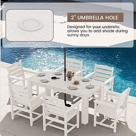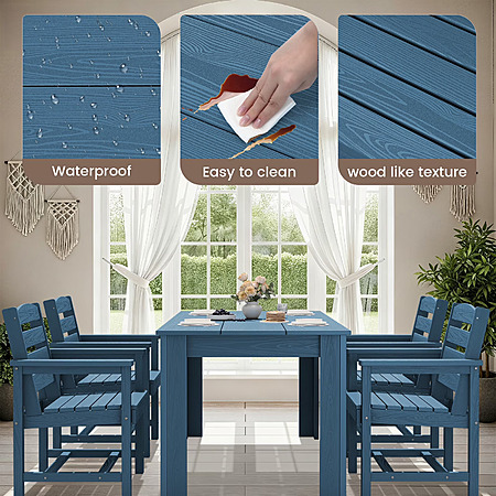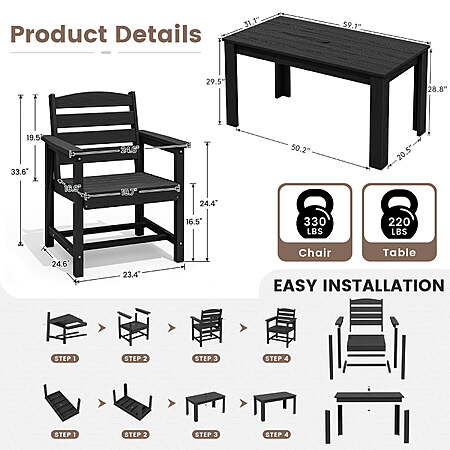| Product Description: | SERWALL Outdoor Dining Set – Waterproof & All-Weather HDPE Furniture: Upgrade your outdoor space with the SERWALL dining set, crafted from durable HDPE material for superior weather resistance and waterproof performance. The 59" outdoor dining table pairs perfectly with our extra-wide seating dining chairs(Mix and match chairs and tables which sold separately) to fit your space and needs, offering ample space for comfortable dining in any setting—whether it's a patio, garden, balcony, or poolside. Versatile 7-Piece Patio Dining Set for Dining and Entertainment. Effortlessly accommodating most households, this complete set (1 table + 6 chairs) is equally suited for relaxed daily use and hosting guests, making it the perfect all-in-one choice for your patio. Create Your Perfect Outdoor Setting: Designed to be the heart of your patio, this large 59.1-inch table offers abundant space for alfresco dining and social gatherings. Crafted from resilient HDPE, it combines a generous footprint with a 220-lb load capacity, ready to hold countless memories with friends and family. Dimensions & Capacity: Each outdoor dining chair measures 23.4"D × 23.6"W × 33.6"H and supports up to 330 lbs—sturdy enough for everyday use while maintaining a sleek profile. Durable & All-Weather HDPE Material: Engineered to withstand sun, rain, and snow, this outdoor dining set resists fading, rust, and mildew, guaranteeing year-round durability. Unlike metal or wood sets, this HDPE dining furniture will not rot, crack, or splinter, ensuring your investment lasts for seasons to come. Easy & Quick Assembly: This HDPE outdoor dining set comes partially assembled with all necessary hardware and clear instructions. You can set up the entire table and chairs in minutes with the help of our online video guide. For best results, avoid overtightening the screws until the unit is fully assembled. Effortless Cleaning for More Relaxation: Spend less time on upkeep and more time enjoying your outdoors. A quick wipe with soap and water is all it takes to keep your SERWALL chairs looking fresh and new, season after season. Customer Support: Have questions? Our team is here to help with your HDPE dining chairs or any outdoor dining chair needs. |