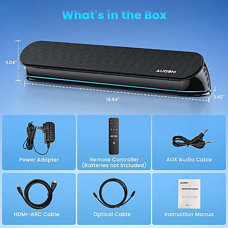 | Product Description: | At AUOSHI, we focus on crafting intelligent audio products that combine refined design, real-world performance, and responsive customer support—product quality over flashy promotion. Upgrade your TV audio into a professional-grade setup with the AUOSHI 2.1-Channel Soundbar. Combining 60+W peak power output, Bluetooth 5.4, and DSP digital tuning, this system delivers cinematic 3D sound with consistent volume control, precise dialogue clarity, and reduced signal delay. The sleek, compact trapezoidal body blends beautifully with any décor and supports multiple installation options — place it under your TV, stand it vertically for stereo effect, or mount it on the wall to save space. Simple plug-and-play setup with the included remote control lets you instantly enjoy immersive audio for movie nights, gaming sessions, music streaming, or everyday listening. ✔️Features: True 2.1-Channel Cinematic Sound (60+W Powerful Output) — Equipped with left/right full-range speakers and a dedicated wireless subwoofer, the AUOSHI soundbar delivers up to 60+W of dynamic audio power. Experience balanced mids, crystal-clear highs, and deep, room-filling bass that immerses you in every movie, playlist, and gaming battle — transforming your living room into a true mini home theater. Bluetooth 5.4—Enjoy faster pairing, wider compatibility, lower latency, and enhanced energy efficiency with advanced Bluetooth 5.4 technology. 5 Sound Modes & DSP Tuning — Switch between Movie, Music, Gaming, News and Dialogue modes to optimize EQ for any content. DSP processing enhances clarity and immersion. Multi-Input Connectivity —Seamlessly connect to your TVs, smartphones, laptops, tablets, or projectors—or switch to wired playback via Bluetooth, HMI-ARC, Optical, AUX, or USB for flexible entertainment. Dual Control Options—Adjust volume, EQs, and source via included remote or onboard buttons for total convenience from any distance. Compact, Stylish & Versatile Mounting — Slim trapezoidal design fits under TVs, on desktops, or wall-mounted with included hardware. Perfect for living rooms, bedrooms, dorms, and small apartments. Reliable After-Sales Care — We stand behind every AUOSHI product with a 24-month warranty and 24/7 online support. Your satisfaction is always our top priority. Bring cinematic audio to your home—compact design, powerful bass, and the latest Bluetooth 5.4 connectivity. Order AUOSHI today. ✔️Specifications: Channel: 2.1 Channel (2 full-range + subwoofer) Power: 60+W Bluetooth version: Ver. 5.4 Transmission distance: >15M(50feets) Bluetooth Protocol: A2DP/AVRCP/HFP/HSP Connectivity Technology: Bluetooth 5.4, HDMI-ARC, Optical, AUX(3.5mm), USB EQ Modes: Movie / Music / Gaming / News / Dialogue (5 modes) Size: 16.5'' x 4.4'' x 3.0'' Signal-to-Noise Ratio: ~90dB (spec sample) Warranty: 24 months; 24/7 online support ✔️What's in Package: 1 x Small Soundbar;1 x Power Adapter;1 x Remote Controller(Batteries not included);1 x AUX Audio Cable;1 x HDMI-ARC Cable;1 x Optical Cable;1 x Instruction Manual ✔️Q&A Instructions: Q1: Why is the unit not turning on? A1: Please check and make sure the power cord is correctly connected to a power source. A2: Reconnect the power cord. Q2: Why the remote control does not work? A1: Replace with new batteries. A2: Aim the remote control at the LED light on the main unit. Q3: Why there is no sound in the soundbar? A1: Please make sure that the TV has an audio output interface. A2: Press the Mute button to switch on the sound. A3: Check to make sure the audio cable is correctly connected. A4: Please set the TV to digital audio output and select PCM output A5: Make sure there is no other audio port input on your device. Q4: Why the sound is distorted? A1: Adjust to the music, movie, or news mode corresponding to the specific scene by the remote control. Q5: Why the HDMI dose not work? A1: Please connect your Soundbar to the HDMI-ARC port ONLY when setting it up via HDMI mode. If there is no sound coming out please switch your TV sound setting to PCM audio output. Louder Soundbar builts-in 60+W power, 2 tweeters and a subwoofer. Bluetooth 5.4 PC speaker for wireless music and gaming. Sound bar for TV built-in DSP and Subwoofer. Small sound with DSP tuning and 5 EQ modes. Compact computer speaker built-in buttons & remote dual control. TV sound bar supports multiple connections for flexible home and desktop setups. Stylish and compact design and meet various installation methods. ✔️More Q&A Instructions |