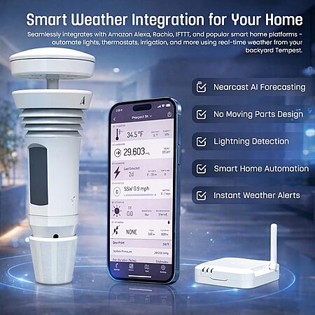 - Smart Home Automation – One of the most advanced weather stations for connected homes, Tempest integrates with Amazon Alexa, Rachio, IFTTT, and other smart platforms to automate lights, thermostats, irrigation, and more using real-time weather data from your backyard.