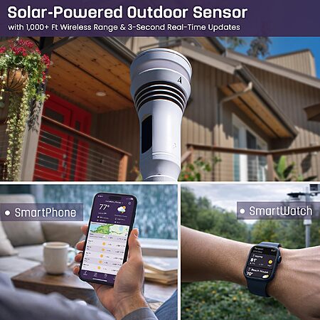 - Wireless Long-Range Monitoring – This wireless weather station features a solar-powered outdoor sensor that transmits data up to 1,000+ feet and delivers real-time weather updates every 3 seconds.