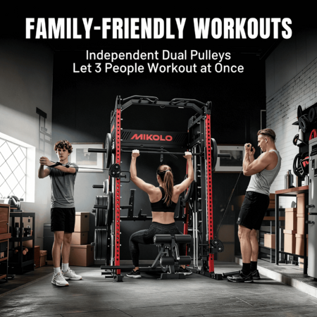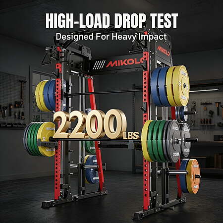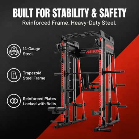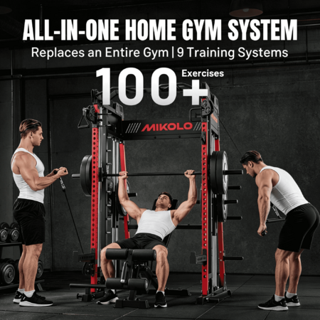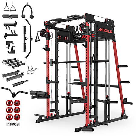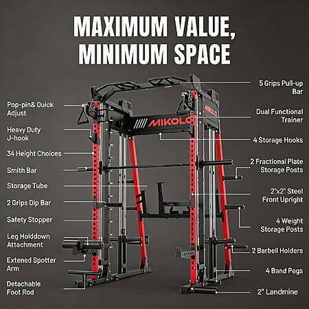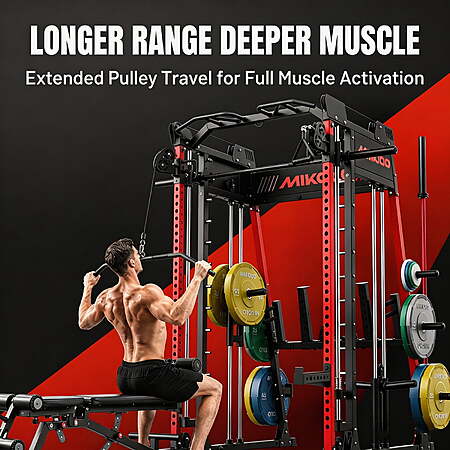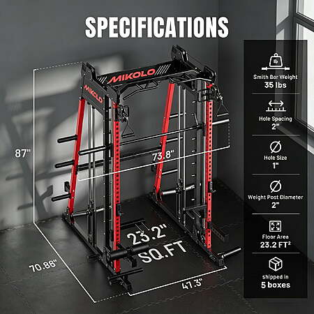 | Product Description: | Not Having Enough Space for Different Gym Equipments? The Mikolo M11 is an upgraded Smith machine home gym built on the proven M4 platform. This all-in-one home gym combines a power rack, Smith machine, functional trainer, cable crossover, lat pulldown station (includes leg holder) , 1:2 ratio low row station (includes footplate attachment), landmine, pull-up station, and dip station into one versatile setup for full body strength training at home. Compared with the M4, the M11 adds stronger 2 mm front uprights, a finer 34-hole adjustment system, a higher front pulley for a fuller range of motion, a rear storage tube for attachment organization, improved spacing around the Smith bar and weight storage, and higher top lock positions that keep the bar farther out of the way between sets. The result is a cleaner, smoother, and more user-friendly home gym system designed for both beginner and advanced lifters. Dimension: Material: 14-gauge Steel Overall Height: 87-in Overall Width: 47.3-in Overall Depth: 70.86-in Weight Post Diameter: 2-in Product Weight: 375 lbs Pulley System Capacity: 400 lbs on each side Safety Catch Capacity: 500 lbs Dip Bar Capacity: 400 lbs Smith Bar Capacity: 600 lbs Weight Capacity: 2200 lbs Cable System Ratio: 1:2 Number of Package: 5 Packages Included: - 1x Smith Machine - 1x T bar - 1x Tricep rope - 2x Cable handle - 1x Cable bar - 1x Lat pull down bar Stronger Frame More Precise Setup: Built on the same all-in-one power rack foundation users love, the M11 takes stability one step further with upgraded 2 mm front uprights for a stronger, more secure training feel. It also improves the adjustment system from the M4’s 15 height settings to 34 holes on both the uprights and pulley columns, giving you more precise placement for J-hooks, safety arms, and cable movements. All-in-One Training System with Fuller ROM: The M11 is designed to support a wide range of upper-body and lower-body workouts in one compact setup. It combines Smith machine training, cable crossover, lat pulldown, low row, pull-ups, dips, landmine work, and other strength movements, helping you train chest, back, shoulders, arms, legs, and core without needing multiple machines. The raised front high pulley also creates a longer range of motion for cable exercises, so movements like lat pulldowns and flys feel smoother, stretch deeper, and work especially well for taller users. More Attachments Better Organization: The M11 is built with a complete storage system to keep your setup organized, efficient, and easy to use. It features 2 barbell holders, 1 attachment storage tube for rack-mounted attachments like J-hooks, dip bars, and safety arms, 4 weight plate storage pins, 2 fractional plate storage pins, and 4 storage hooks for accessories. With dedicated space for bars, plates, and attachments, the rack stays cleaner, equipment is easier to access, and transitions between exercises feel faster and more convenient. Better Walk-Through Space Inside the Rack: The M11 keeps the multi-exercise versatility of the M4, giving you a complete setup for full-body strength training in one machine. It also adds two higher Smith bar lock positions, allowing the bar to be stored farther up and more fully out of the way. This creates better walk-through space inside the rack and makes transitions into movements like RDLs, hip thrusts, and other in-rack exercises more comfortable. We provide a lifetime of component replacement service for customers and contact us with any of your concerns, you will be answered within 12 hours. The item will be shipped in FIVE packages(which may not be arrived at the same time, please check the package status on the carrier's website). |