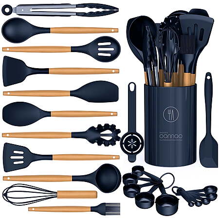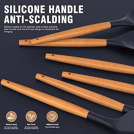 | Product Description: | Introducing a comprehensive and high-quality silicone cooking utensils set that includes essential kitchen tools for both beginners and skilled cooks. This cooking utensil set is BPA-free, odorless, and made from natural, food-grade silicone, ensuring health and safety. With outstanding scratch resistance, these kitchen utensils are non-stick cookware friendly, providing worry-free cooking enjoyment. The cooking utensil set is heat-resistant up to 446°F, featuring a one-piece molding design with stainless steel cores for shape retention and flexibility. The silicone kitchen utensils are non-deformable, easy to clean, and come with a convenient utensil holder. The package includes 9 cooking tools, 4 baking tools, and wooden-handled measuring cups and spoons. Additionally, the silicone utensils make for an excellent gift selection for housewarmings, weddings, or New Year celebrations. The seller ensures rapid after-sales response and encourages customers to contact them for any inquiries or concerns. BPA FREE NON-STICK COOKWARE FRIENDLY: The silicone cooking utensils set is made entirely from natural, odorless food-grade silicone, molded as a single piece, and has passed laboratory testing standards. utensil sets is BPA-free, odorless, ensuring health and safety. With outstanding scratch resistance, its lifespan extends beyond three years. Enjoy the pleasure of cooking without worrying about the silicone cooking utensils scratching your non-stick cookware HEAT-RESISTANT & NON-MELTING: These silicone kitchen utensils set withstand temperatures up to a sizzling 446°F, even during high-temperature frying. Silicone doesn't melt and does not react with food. High-quality natural wood prevents the transfer of heat during cooking. The small round hole at the end facilitates hanging to eliminate clutter. Please note that each silicone kitchen utensil wooden handle has a slightly different color and texture COMPLETE BASIC KITCHEN SET MEETS COOKING NEEDS: These silicone cooking utensil set includes all tools from beginners to skilled cooks. With 9 cooking tools, 4 baking tools, and a spacious utensil holder, you have every essential kitchen tool at your fingertips: Slotted Turner, Solid Turner, Deep Soup Ladle, Pasta Server, Flexible Spatula, Spreader Spatula, Slotted Spatula, Basting Brush, Egg Whisk, Slotted Spoon, Kitchen Tongs, 5 x Measuring Cups & 5 x Measuring Spoons ONE-PIECE MOLDING, NON-DEFORMABLE, EASY TO CLEAN: We've designed these silicone kitchen utensils sets with stainless steel cores wrapped in silicone for shape retention and flexibility. No warping or cracking, no hassle. The silicone utensils for coking one- piece construction ensures no pesky gaps where food can hide, making cleaning a breeze. Due to the unique nature of wooden handles, we recommend handwashing IDEAL KITCHEN ESSENTIAL: This silicone kitchen utensils set boasts a sleek, practical design that fits modern and classic kitchen styles. Suitable for daily use or as a thoughtful gift (weddings, housewarmings, birthdays), adding convenience and efficiency to every cooking routine |