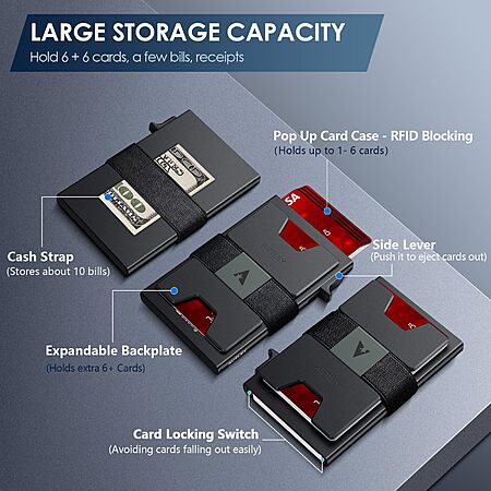 • 【Quick Access Card】The smart wallet features built-in ejection mechanism. Simply push the side lever, the cards pop up at a step pattern so you can grab the card you want. Convenient to use, fast checkout, no waiting.
