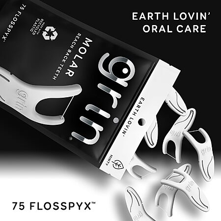 Model: GRIN Molar Flosspyx, Floss Picks, 75 Count, Dental Flossers, Minty Flavor, Recycled Plastic, Great for Reaching Back Teeth, Slide Easily Between Teeth, Includes Safe Soft Fold-Back Tooth Pick