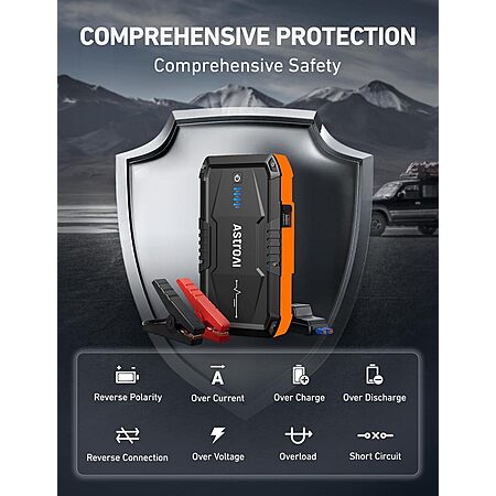 • 5-IN-1 MULTIFUNCTION - This device functions as a jump starter, portable power bank, and an LED flashlight with 3 modes (flashlight, strobe, SOS). The AstroAI Lithium Battery Jump Starter is your reliable, all-around trip companion here to gear you up for every adventure.