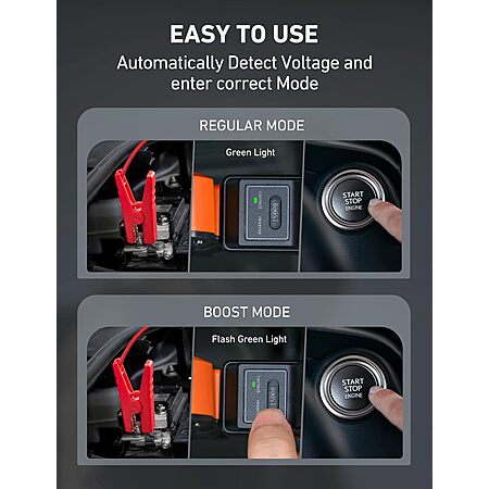 • ULTRA POWERFUL BOOST - The smart boost mode automatically detects the battery's voltage. When the voltage is less than 9 V, the indicator flashes green; this unlocks the "BOOST" button, which can be pressed to start fully-drained batteries.