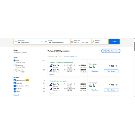 Icelandair via Booking.com have round trip airfares travelling from Boston (BOS) to Copenhagen Denmark (CPH) for $456, making 1 stop in Iceland both ways for a few hours. There are plenty of flights to choose from. On Icelandair, your low economy light airfare only allow a personal item and a carry-on bag.