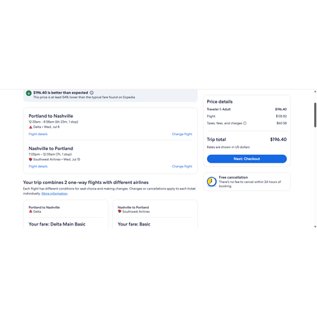 Delta Air Lines, American Airlines. Southwest Airlines and Expedia have round trip airfares travelling to and from Portland OR (PDX) and Nashville TN (BNA) for $197, making 1 stop both ways. These are basic economy fares that allow a personal item and a carry-on bag. There is no seat selection and no change. If you are travelling with children on American, you will be seated together as per AA's policy.