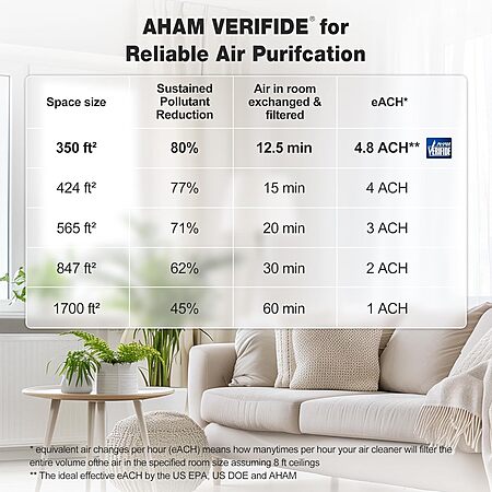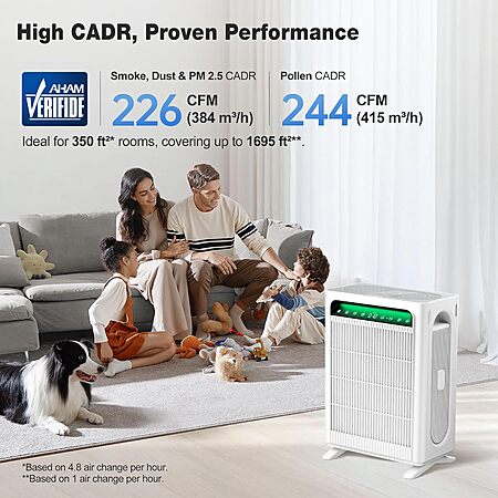𝐀𝐇𝐀𝐌 𝐕𝐞𝐫𝐢𝐟𝐢𝐞𝐝 & 𝐇𝐢𝐠𝐡 𝐂𝐀𝐃𝐑 𝐕𝐚𝐥𝐮𝐞: Certified by the Association of Home Appliance Manufacturers, this air purifier provides reliable performance with a Smoke/Dust/PM2.5 CADR of 226 CFM (384 m³/h) and a Pollen CADR of 244 CFM (415 m³/h). AHAM certification guarantees effective, high-speed air purification for your home.