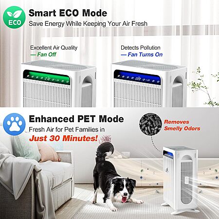 𝐏𝐄𝐓 & 𝐄𝐂𝐎 𝐌𝐨𝐝𝐞𝐬: PET Mode increases airflow to tackle pet hair, dander, and odors, refreshing the air in just 30 minutes. ECO Mode saves energy and extends filter lifespan by entering standby when air quality is excellent, then restarting automatically when purification is required.