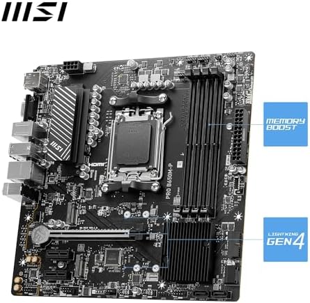 Model: MSI PRO B650M-P V1 Motherboard, Micro-ATX - Supports AMD Ryzen 9000/8000 / 7000 Series Processors, AM5 - DDR5 Memory Boost 6000+MHz/OC, 1 x PCIe 4.0 x16, 2 x M.2 Gen4, 2.5G LAN