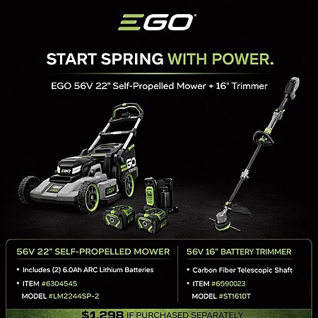 EGO POWER 1000 series 22" mower, 2 6ah batteries, 16 inch trimmer, $899 - Lowe's