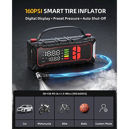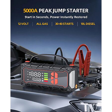 StarST via Amazon[amazon.com] has for Prime Members: Soramir 5000A Car Battery Jump Starter w/ 160PSI Air Compressor on sale for $49.99 - $23 off when you enter the coupon code 8XFHGB5X = $26.99. Shipping is free.