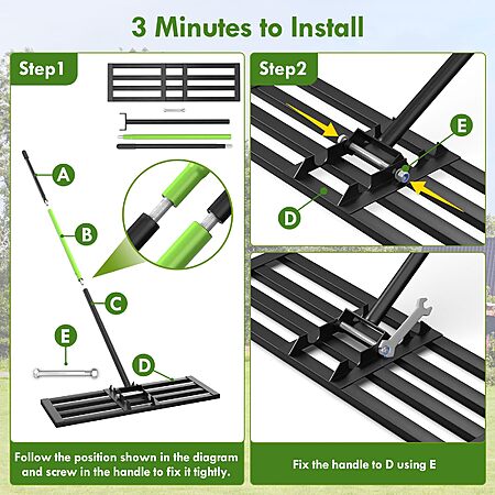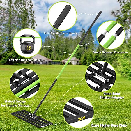 - Square Tube Design – No Dirt Accumulation: The lawn leveling rake is entirely made of square tubes, which, compared to grooved designs, prevents dirt from accumulating. Additionally, the smooth bottom surface enhances ease of pushing and pulling. Using our leveling rake makes achieving a perfectly level lawn effortless! It helps you spread topsoil, tidy up your yard, or distribute fertilizer. The rake also features a slot for convenient storage of the handle rod, making it more practical