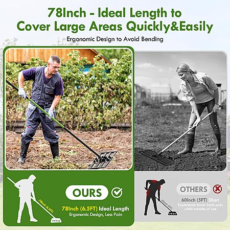- Threaded Handle Connection Design: Our leveling rake features a sturdy threaded handle connection for enhanced durability. The approximately 78-inch (6.5 FT) handle also showcases a stylish two-tone design, making it both functional and visually appealing. Built to resist bending, the rake is lightweight, easy to operate, and highly maneuverable. You can comfortably use our lawn leveling rake for hours without discomfort