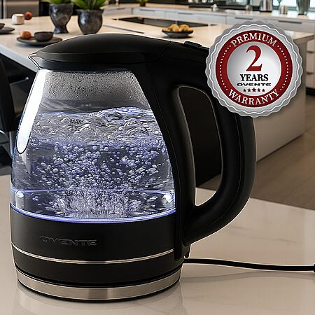 - A BLEND OF STYLE & DURABILITY – The OVENTE KG83 Kettle Series holds the #1 spot among our best-selling products, beloved by customers across the USA for its aesthetics, durability, and functionality. Featuring a halo of blue LED lights that illuminate the kettle during use, it's constructed from heat-tempered, stain-resistant borosilicate glass and stainless steel, ensuring long-lasting performance.