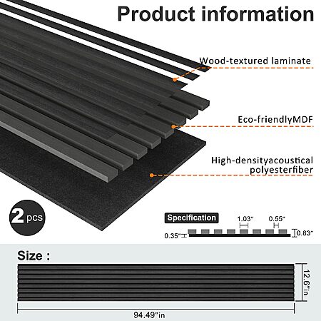ROOMTEC Acoustic Wood Wall Panels, 2 Pack 94.5" x 12.6" Soundproof Wall Panels,Wood Slat Wall Panels for Interior Wall Decor (Black) on sale for