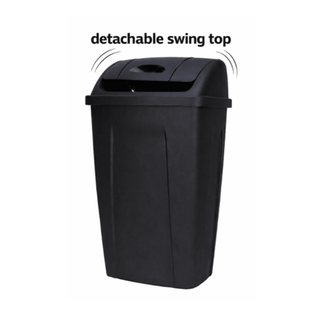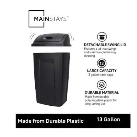 | Product Description: | The Mainstays Kitchen Trash Can, 13 Gallon Plastic Garbage Bin with Swing Top Lid, Black is a durable and practical solution for managing household or office waste. Made from sturdy polypropylene plastic, this large trash can is lightweight, long-lasting, and easy to clean for everyday convenience. The swing-top lid provides quick, touch-free disposal while helping to keep odors contained, and the detachable lid makes bag changes and cleaning simple. With its 13-gallon capacity, this trash can fits standard kitchen trash bags, offering plenty of room for daily use. Sleek and functional, the Mainstays 13 Gallon Black Trash Can blends seamlessly into kitchens, laundry rooms, garages, or workspaces. Mainstays Kitchen Trash Can, 13 Gallon Plastic Garbage Bin with Swing Top Lid, Black Durable Plastic Construction: Sturdy plastic design resists everyday wear while remaining lightweight and easy to move Easy-to-Clean Surface: Smooth finish wipes down quickly, helping maintain a fresh appearance with minimal effort Dual Swing Lid Design: Lid swings inward when pushed or lifts up for quick access, making trash disposal simple and hygienic Standard 13 Gallon Capacity: Accommodates widely used 13-gallon kitchen trash bags, reducing the need for frequent emptying Space-Saving Shape: Designed to fit conveniently in kitchens, bathrooms, garages, or offices without taking up excess floor space Modern Black Finish: Versatile black color complements a variety of décor styles while keeping a sleek, understated look |