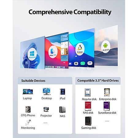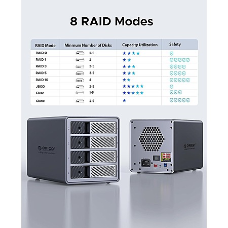 - 8 modes of configuration including RAID 0, 1, 3, 5, 10, JBOD, CLONE, and CLEAR, to achieve dual data backup, enhance data security