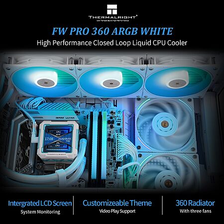 Model: Thermalright FW PRO 360 ARGB White-360mm AIO CPU Liquid Cooler,IPS LCD Screen with 320 * 320 Resolution,for AM4/AM5/Intel LGA1700/1851,’2.73 inch’Magnet-Absorbent LCD Screen for Images