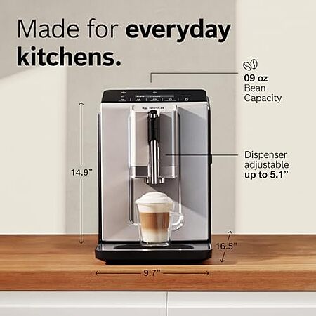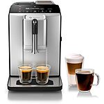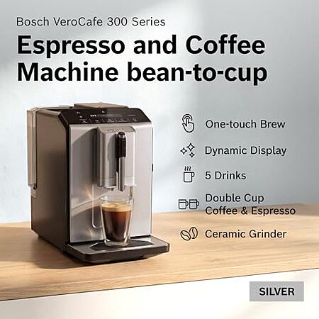 Model: Bosch TIU20307 300 Series Fully Automatic Espresso Machine with Milk Express (in-cup frother), LCD + Touch Control Panel, OneTouch Milk-based Beverages and 5 Beverage Options, in Silver