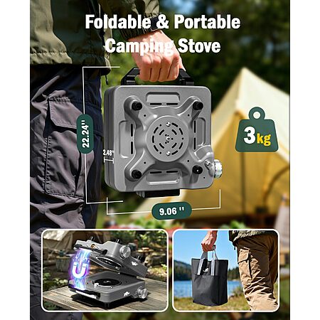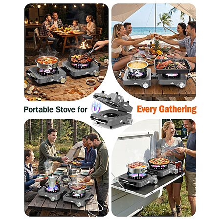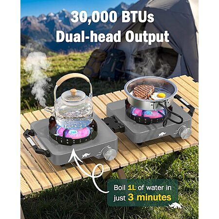 SiuMask via Amazon.com has 2 Propane Burners Camping Stove, 30,000 BTU Folding Camp Stove with Windproof Grates and Frying Pan,Portable Camping Stoves with Carrying Bag,Camping Essentials for Tailgating/Grilling/Coffee,Titanium on sale for $39.19.
