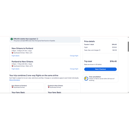 Delta Air Lines, American Airlines. Southwest Airlines and Expedia have round trip airfares travelling to and from New Orleans (MSY) and Portland OR (PDX) for $197, making 1 stop both ways. These are basic economy fares that allow a personal item and a carry-on bag. There is no seat selection and no change. If you are travelling with children on American, you will be seated together as per AA's policy.