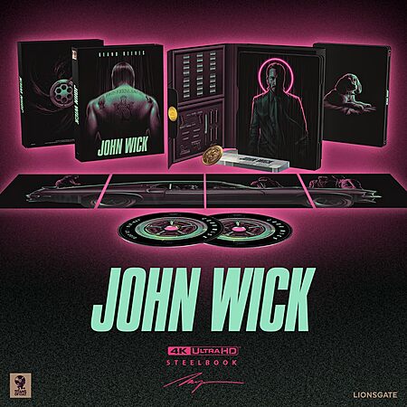 The John Wick 10th Anniversary Titans of CultTM 4K UHD + Blu-rayTM + Digital SteelBook – featuring the film in Dolby Vision for the first time – celebrates the world's most lethal assassin with a two-disc package as iconic as the man himself. Inside are discs styled like the tires on Wick's 1969 Ford Mustang Boss 429; a unique pin designed as a golden Continental coin; an acrylic Cult Stand to display the original artwork by Matt Ryan Tobin; and four collectible art cards. Arranged together, the cards showcase the infamous gas station scene, but when viewed separately they depict the elements – Wick, Daisy, and the criminals fated to unleash Wick's vengeance – that make that pivotal moment so memorably tense. Special Features include an audio commentary with filmmakers Chad Stahelski and David Leitch; the featurettes "Don't F*#% with John Wick," "Calling in the Cavalry," "Destiny of a Collective," "Assassin's Code," "Red Circle," and "NYC Noir"; the John Wick Anniversary Panel at IGN Live; and the Theatrical Trailer.