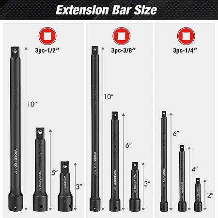 WORKPRO 9PC Impact Socket Driver Extension Bar Set 1/4" 3/8" 1/2 Drive Extension, $12.94, FS, ebay