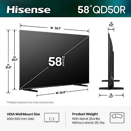 YMMV, Hisense 58-Inch QD50 Series QLED 4K UHD Smart Roku TV (2026) - QLED, Dolby Vision, HDR10, HLG, Game Mode Plus, VRR / ALLM, DTS Studio Sound, Google Assistant, $218, pickup