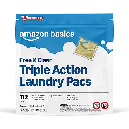 Amazon Basics Laundry Detergent Pacs, Free & Clear, Powerful Triple Action, Hypoallergenic, Unscented, 112 Count $18.67 FS Prime or $35