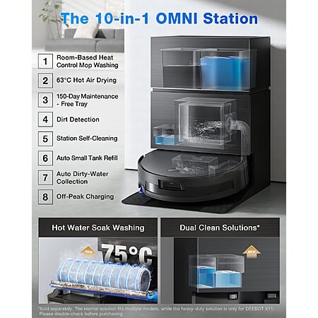 - OMNI Dock: Auto dust-emptying, hot water mop wash, and 145°F air drying keep the system fresh for up to 150 days.