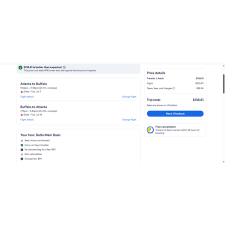Delta Air Lines and Expedia have peak summer round trip airfares travelling to and from Atlanta (ATL) and Buffalo NY (BUF) for $139, nonstop These are basic economy fares, a restricted-type fare. You may have a personal item and a carry-on bag. There is no seat selection and no change.